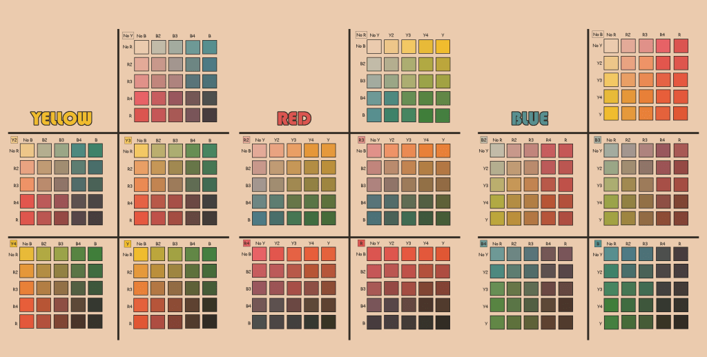 Next up: limited set of color. We use a color palette consisting of yellow, blue, and red (magenta). On top of that, we have white and black. Of each color, there’s a solid 100%, 75%, 50%, and 25% versions and the palette consists of different mixes of all those shades. For example: orange’s color code would be Y4R3; Y4 meaning solid yellow, and R3 75% red.