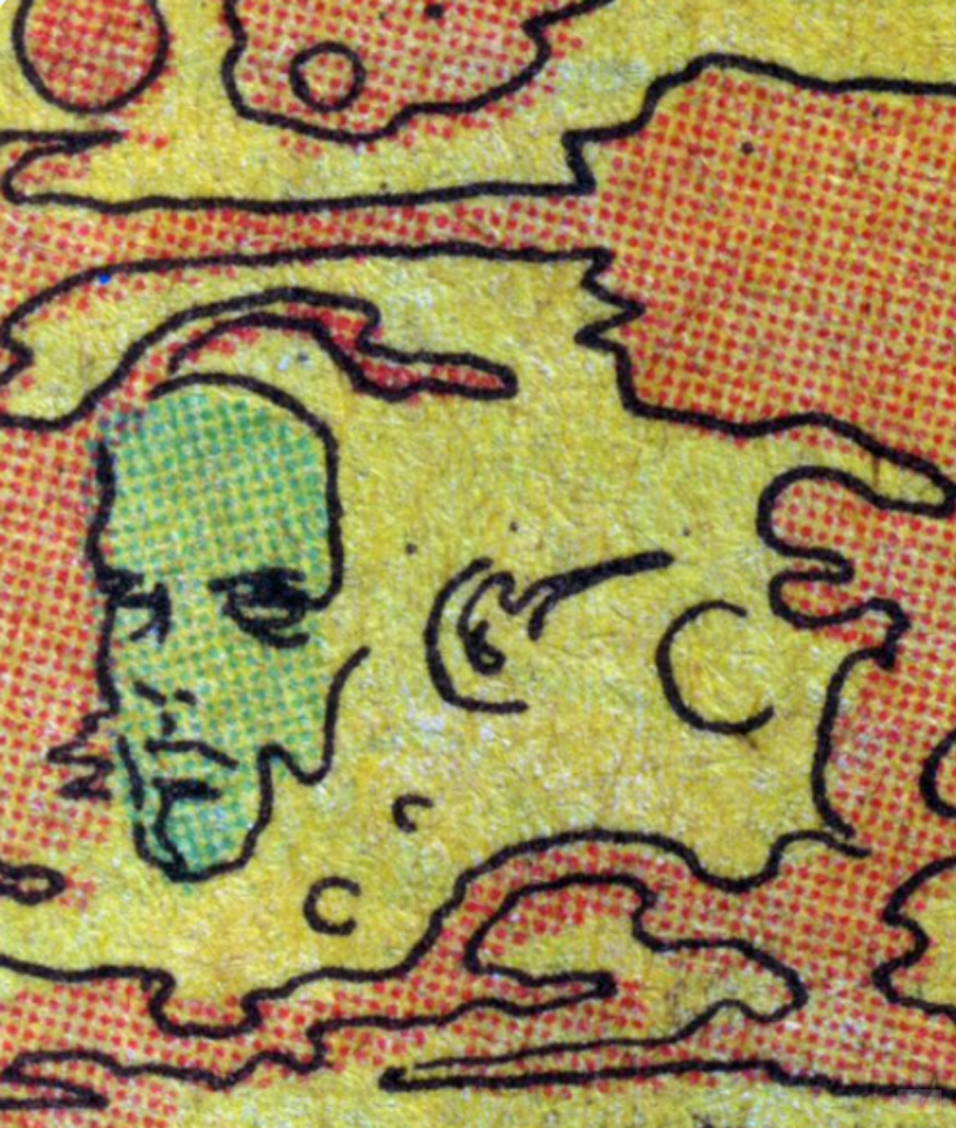Misaligned linework and color: If I’ve understood it correctly, back in the day the black-and-white art was sent to the production department and colors were laid down separately. Other times the artist would color the images and then they would be recreated by the color separators. The colors made by the artist would’ve been only guides and never saw print exactly as how they were intended. Sometimes the overlays would slip and an object would have the color a wee bit to the side; that’s why it seemed like the comic artists couldn’t stay within the lines when coloring.