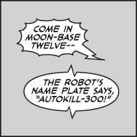 Almost forgot! speech- and thought bubbles: These are the first thing to come to mind when talking about comics, are they not? Though bubbles are nowadays mostly seen as corny and replaced with narration boxes, which can too sound a little dated if not applied properly. Like in the image below, the visual style of the bubble can tell what the source of the sound is, for example, a walkie-talkie or a robot. With a text-based game like ours, these visual cues help tremendously to get the point across.
